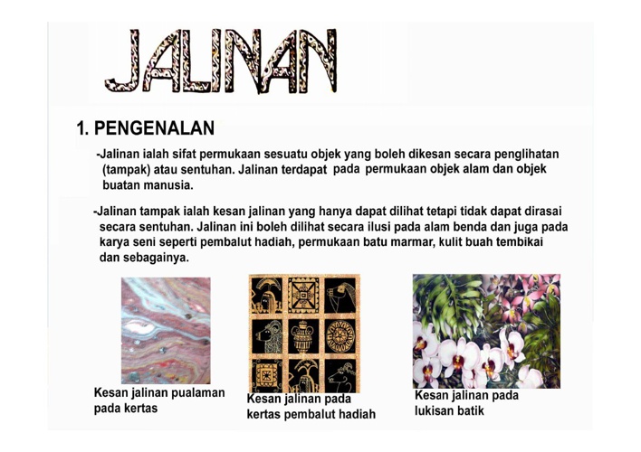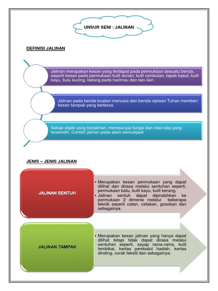 Terdapat dua jenis jalinan iaitu jalinan sentuh dan jalinan tampak. RUPA unsur seni Unsur-unsur Seni - RUPA. Setiap hasil kerja seni dalam penghasilan seni visual memerlukan kombinasi unsur seni dan prinsip rekaan.